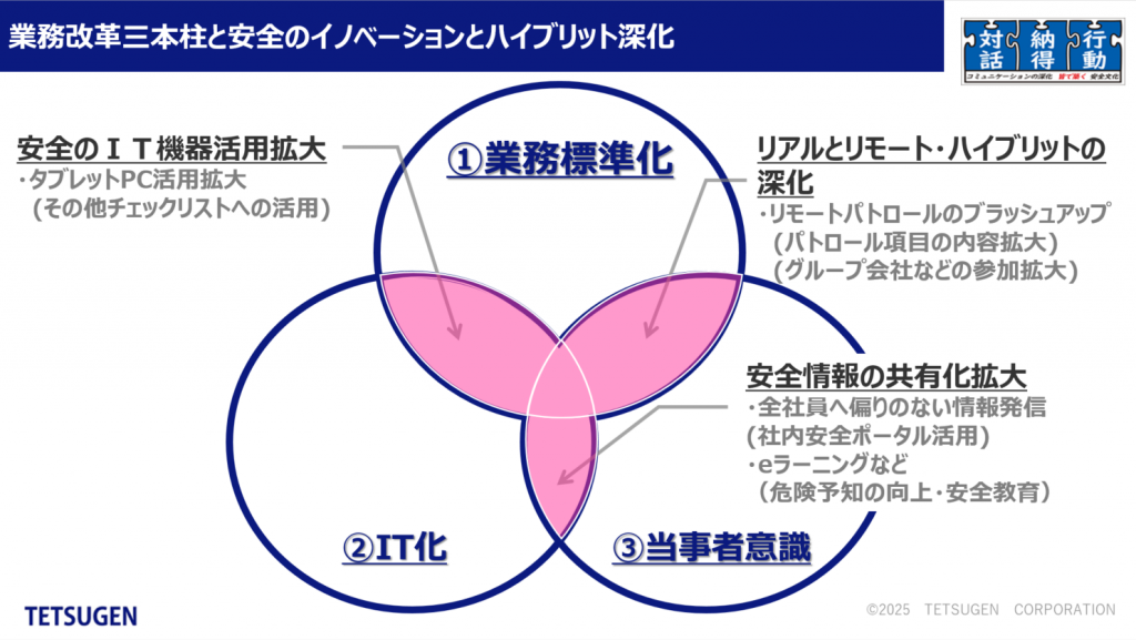 当社が取り組んでいる、①業務標準化②IT化③当事者意識の三本柱とした業務改革のもと、安全活動においてイノベーションとハイブリッド(リアルとリモート)を活用
